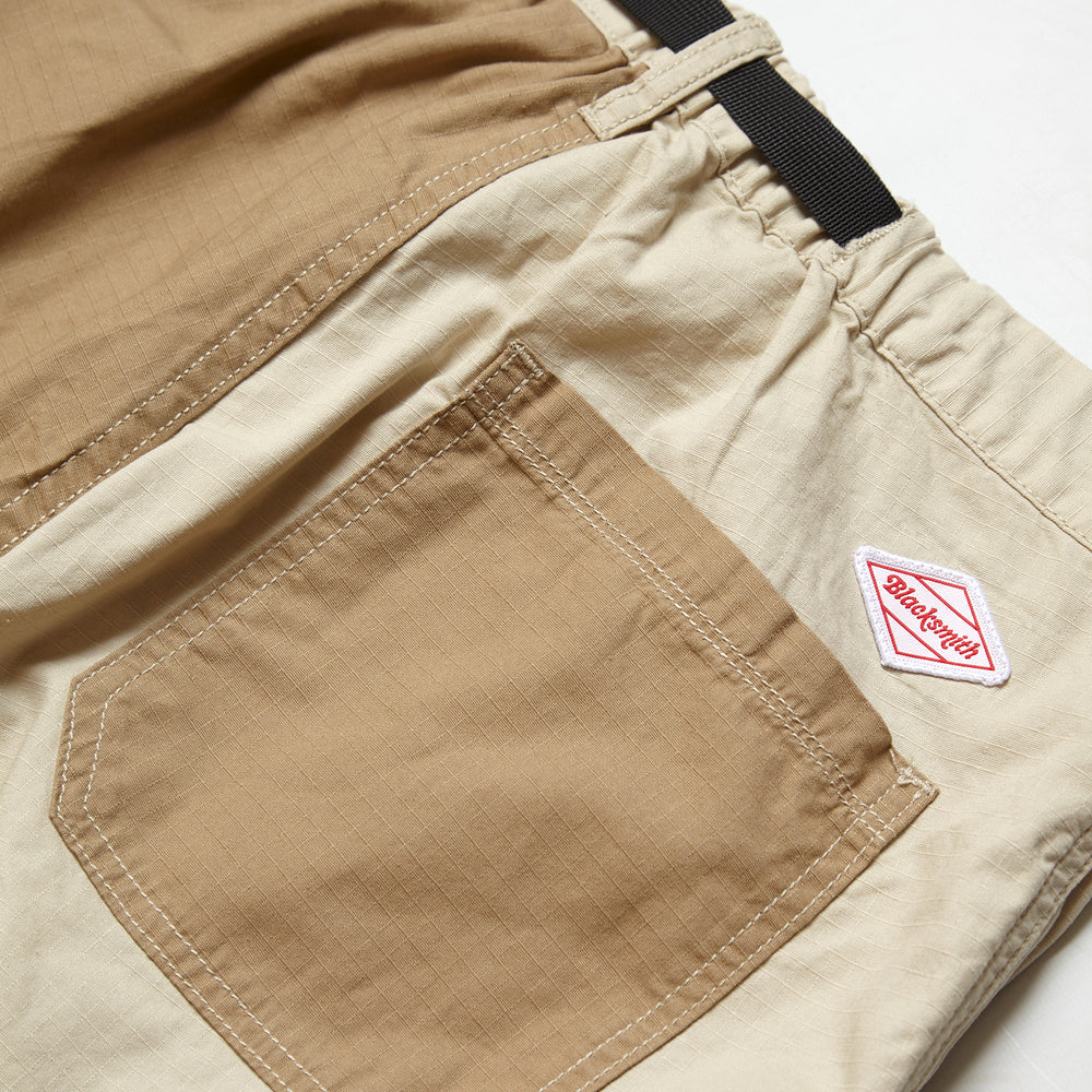 Ripstop Utility Shorts by Blacksmith, Cotton ripstop construction, Raised seam velcro pockets, Embroidered patch above rear pocket, Contrast panels, Adjustable waist cord